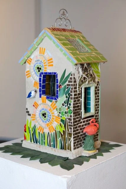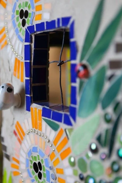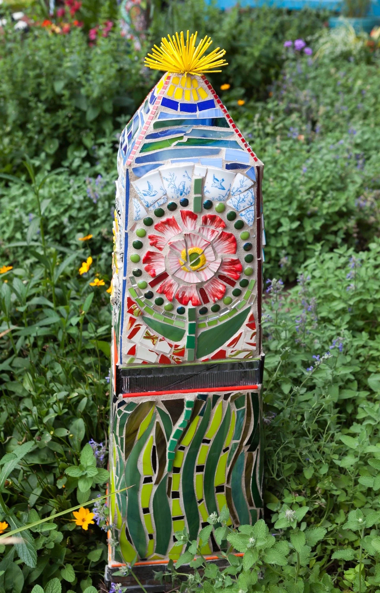 Mosaics in the garden are perfect. They don’t need to be watered, can’t be eaten by bugs, and won’t wilt in the heat. Just add a little sunshine—and when that sunshine reflects on the mosaic, you’ve got bling!